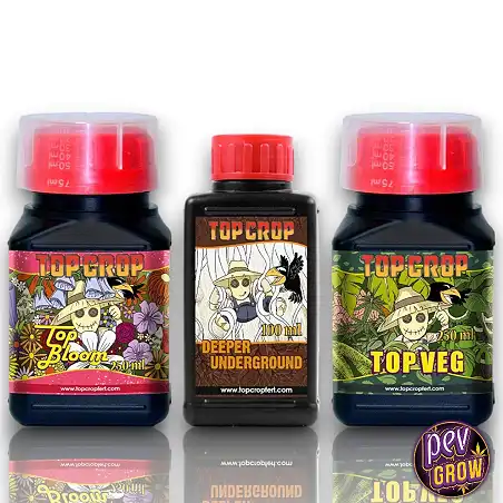 Tripack de fertilizantes Top Crop: incluye Top Veg, Deeper Underground y Top Bloom. Ideal para cultivadores de marihuana que buscan simplificar la nutrición de sus plantas en todas las fases de crecimiento y floración. Disponible en varios formatos.