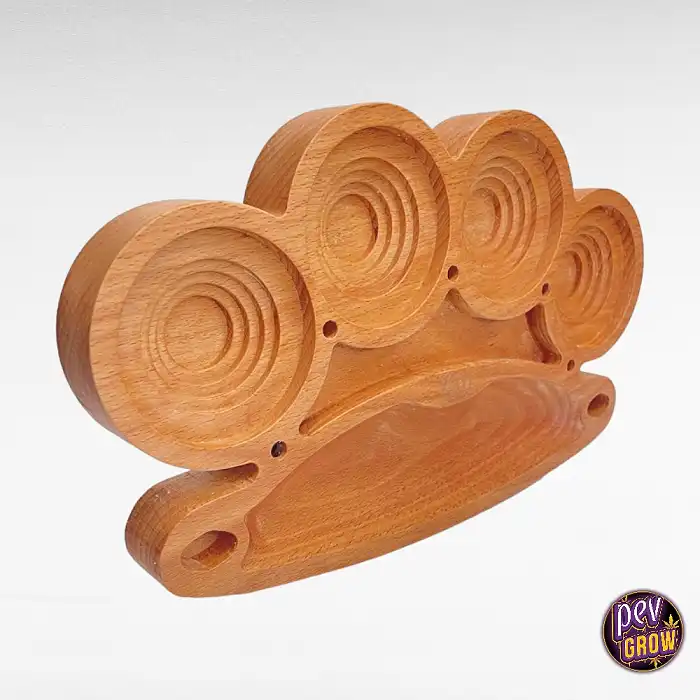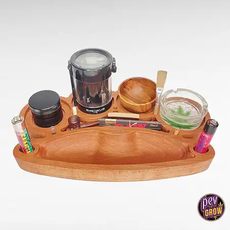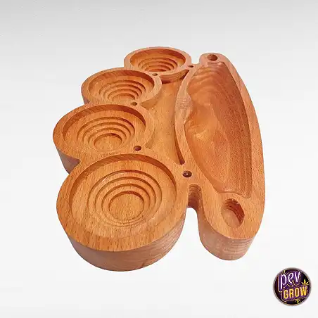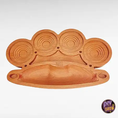 Es una bandeja de liar y almacenamiento fabricada con madera de alta calidad, diseñada para organizar y mantener en orden tus accesorios, herramientas, o cualquier pequeño objeto que necesites tener a mano a la hora de liar, como el grinder de maría, los papeles de fumar, las boquillas de tabaco, etc. Esta bandeja destaca por su construcción sólida y su acabado pulido, lo que le confiere un aspecto elegante y moderno. Su diseño con forma de puño americano es espectacular, e incluye varios compartimentos que permiten una organización eficiente de tus objetos.