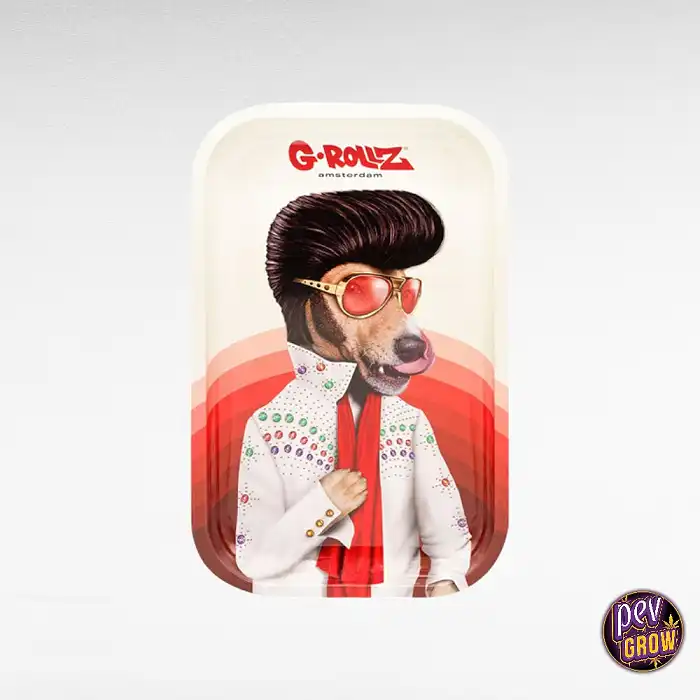 El diseño de esta bandeja de liar destaca por su atractivo visual, con gráficos inspirados en la cultura de Las Vegas como este perro disfrazado de Elvis, ideal para quienes buscan una pieza con estilo y personalidad. G-Rollz es conocido por sus productos de parafernalia con diseños únicos y de calidad superior, y esta bandeja no es una excepción. Además, cuenta con un código QR en la parte posterior para verificar la autenticidad del producto, asegurando que estás adquiriendo un artículo original.