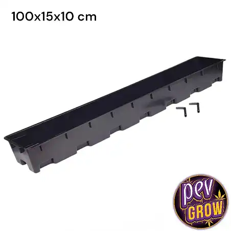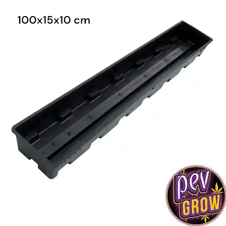 La bandeja que presentamos en Pevgrow tiene unas dimensiones de 100cm de largo, 15cm de ancho y 10cm de alto, lo que la convierte en una opción versátil para diferentes tamaños de slabs. Está fabricada en plástico negro semirígido, lo que facilita su limpieza y garantiza una larga durabilidad.