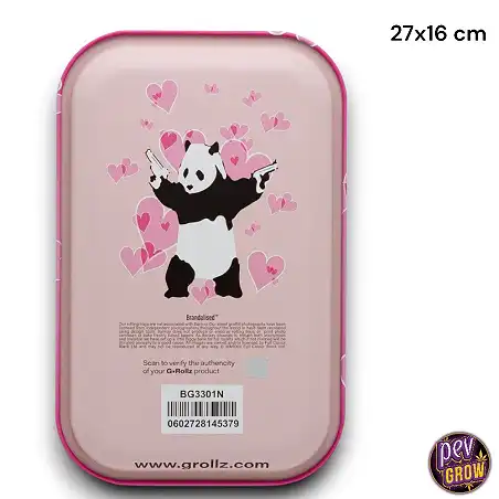 La G-Rollz Panda es una bandeja de metal duradero para liar porros, con un diseño de graffiti de Banksy en fondo rosa. Compacta y portátil, evita la pérdida de hierba y facilita el proceso de liado.