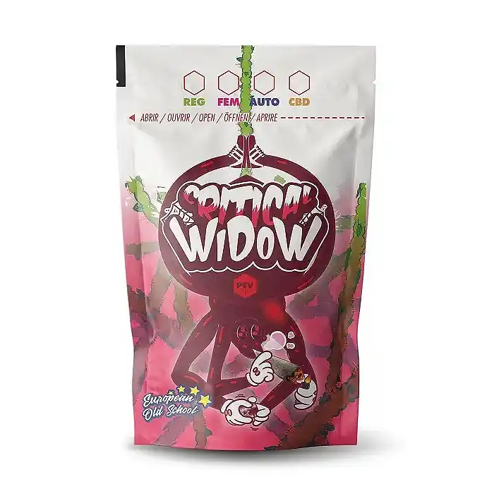 La bolsa de marihuana Critical Widow de PEV Seeds es un envase de aluminio con cierre zip especial para guardar flores de CBD o cogollos de cannabis de la mejor manera posible, ya que permite un gran aislamiento a la temperatura y humedad ambiental y se puede cerrar herméticamente. El potente olor de la yerba ya no será un problema gracias a estas bolsas de marihuana de PEV, y gracias a sus impresionantes diseños serás la envidia de todos tus colegas.