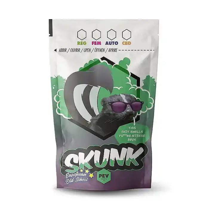 La bolsa de marihuana Skunk de PEV Seeds es un envase de aluminio con cierre zip especial para guardar flores de CBD o cogollos de cannabis de la mejor manera posible, ya que permite un gran aislamiento a la temperatura y humedad ambiental y se puede cerrar herméticamente. El potente olor de la yerba ya no será un problema gracias a estas bolsas de marihuana de PEV, y gracias a sus impresionantes diseños serás la envidia de todos tus colegas.
