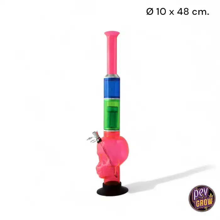 Este bong es un dispositivo diseñado para filtrar y enfriar el humo, proporcionando una experiencia de fumada más suave y placentera. Con una altura de 48 cm, destaca por su material acrílico, que le confiere una gran resistencia a los golpes, a diferencia de los bongs de cristal que son más frágiles. Su llamativo color rojo y el diseño de calavera lo convierten en una pieza con carácter, ideal para añadir un toque distintivo a tu colección de bongs para fumar.