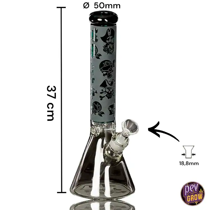 Con su diseño exclusivo de calaveras y símbolos piratas, este bong no solo es un instrumento para el consumo de hierbas, sino también una expresión de estilo y un tributo a la aventura y la libertad.