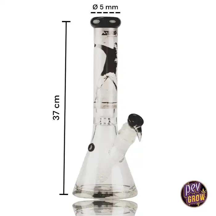 Este bong percolador destaca por su diseño elegante y funcional. Con una altura de 37 cm y un grosor de 5 mm, ofrece una durabilidad excepcional. La decoración de Banksy en la parte superior del tubo añade un toque artístico, mientras que el cómodo anillo de la boquilla asegura una experiencia de uso agradable.
