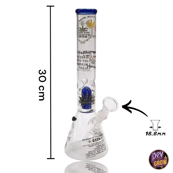 Adornado con gráficos que celebran la cultura del cannabis, este bong invita a una experiencia de consumo consciente. Las muescas para hielo en la parte superior permiten un enfriamiento adicional, y la boquilla de borde redondeado asegura comodidad y un sello hermético.