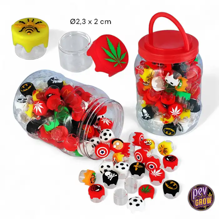 Este práctico set es un bote contenedor que incluye 100 pequeñas cajitas individuales, cada una fabricada en cristal resistente y equipada con una tapa de silicona de alta calidad. Cada cajita mide 25x20mm, un tamaño perfecto para dosis individuales o para organizar diferentes tipos de concentrados, extracciones o pequeñas cantidades de hierbas. Es un accesorio esencial dentro de la Head Shop y Parafernalia de Pevgrow, diseñado para ofrecerte la máxima comodidad y eficiencia.