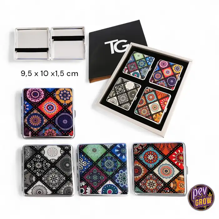 L'expositor de pitilleres Mandala TG és l'armadura definitiva per a les teves cigarretes, combinant una carcassa metàl·lica dura amb dissenys hipnòtics per mantenir les teves 20 unitats intactes, fresques i guardades discretament lluny de mirades indiscretes. És un accessor funcional que substitueix els embalatges de cartró fràgils per una solució robusta, elegant i reutilitzable que cap perfectament a la butxaca o bossa.