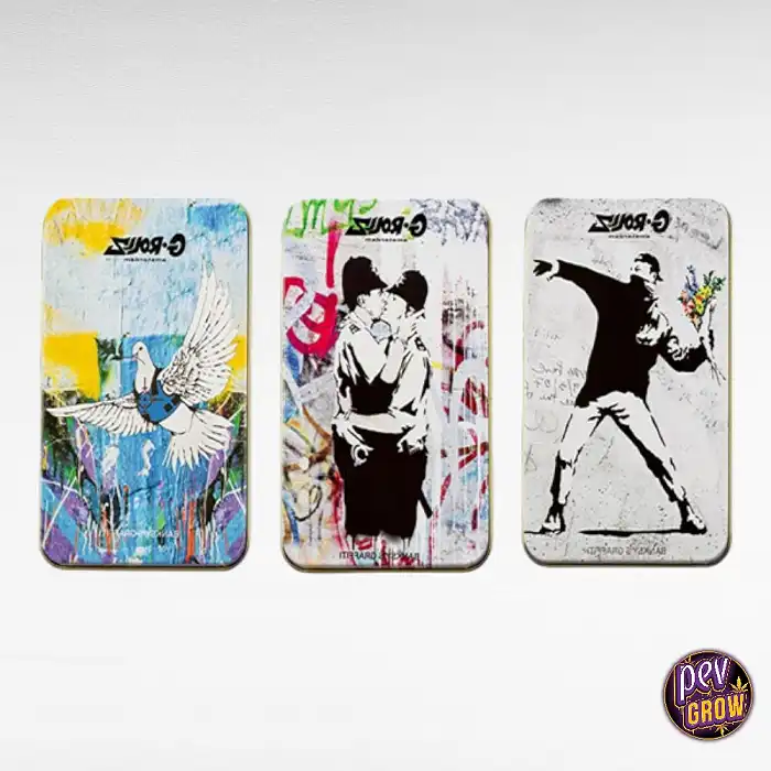 La Cajita Metal G-Rollz Banksy es más que un simple contenedor; es una pieza de colección que captura la esencia del icónico artista callejero Banksy. Diseñada para los conocedores del mundo del cannabis que buscan calidad y originalidad, esta caja metálica no solo protege tus pertenencias, sino que también expresa tu gusto por el arte urbano y la cultura contemporánea.