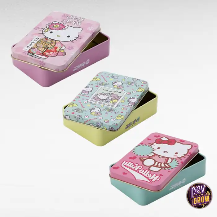 Cajita Metal Hello Kitty (13.5x8.5x3 cm): almacenaje con estilo y funcionalidad. Resistente, con 3 diseños distintos exclusivos de Hello Kitty. Perfecta para guardar flores de CBD o las hierbas que prefieras.