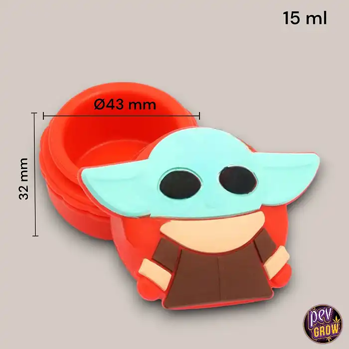El diseño de las Cajitas de Silicona para el BHO Jedi 15ml es vibrante y colorido, emulando la figura de un joven Jedi con grandes orejas y una apariencia adorable. Con un diámetro de 43 mm y una altura de 32 mm, estas cajitas son compactas pero suficientemente espaciosas para almacenar hasta 15 ml de tus concentrados favoritos.