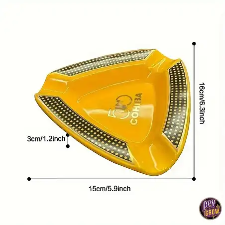 Imagina la calidez del sol reflejada en el vibrante tono amarillo de este cenicero, añadiendo un toque de alegría y sofisticación a tu ambiente. Su forma triangular y sus dimensiones de 16 x 16 x 3 cm lo hacen ideal para cualquier mesa o espacio dedicado a tus puros. Siente la suavidad de la cerámica al tacto y la robustez de su construcción, diseñada para ofrecerte una experiencia de uso inigualable. Este cenicero no es solo un recipiente para cenizas, es una declaración de estilo que complementa tu pasión por los puros.