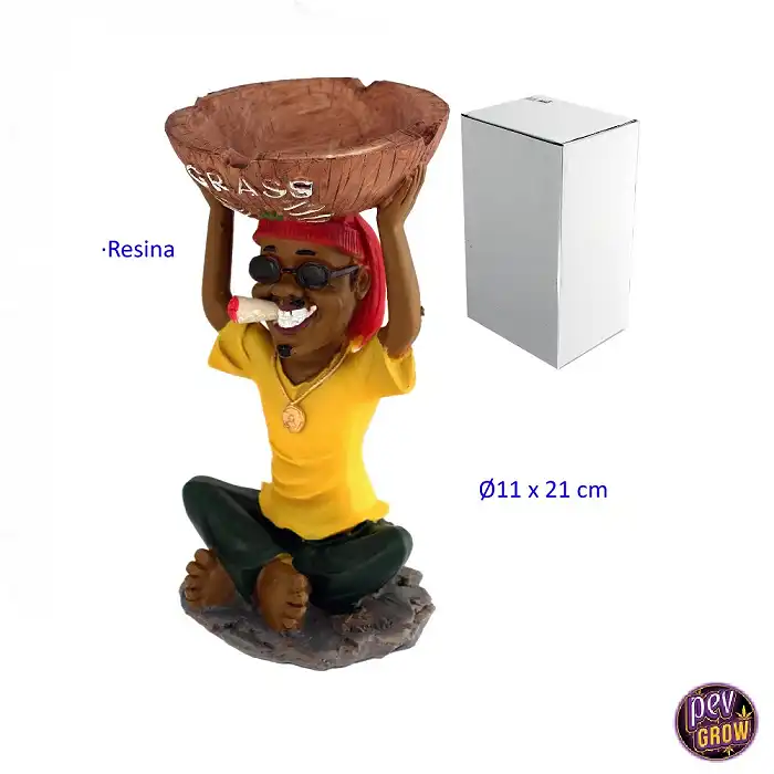 Cuando eliges este cenicero, no solo adquieres un objeto funcional, sino una pieza que te transporta. Siente la robustez de la resina en tus manos y admira los detalles pintados a mano que dan vida a la figura Rasta. Este cenicero está diseñado para ser resistente a los golpes, asegurando que su encanto perdure en el tiempo. Su tamaño de Ø 11 x 21 cm lo hace ideal para cualquier mesa o rincón, añadiendo un toque de color y alegría. Es el compañero perfecto para tus sesiones, invitándote a disfrutar de cada momento con una sonrisa.