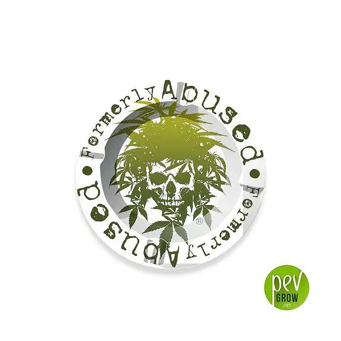 Rodeando el perímetro del cenicero, la frase “Formerly Abused” se presenta en una tipografía clara y concisa, haciendo referencia a la historia de la planta de cannabis y su reciente revalorización como elemento cultural y medicinal.
