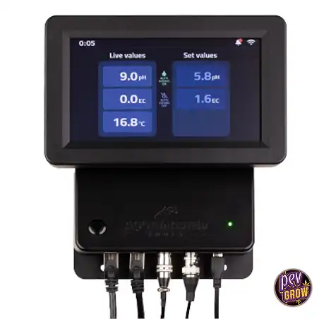 El controlador dispone de bombas peristálticas que dosifican los fertilizantes y regulan el pH en el depósito de agua. Esto asegura que la solución nutritiva esté siempre en el rango apropiado, promoviendo la salud y el rendimiento de tus plantas.