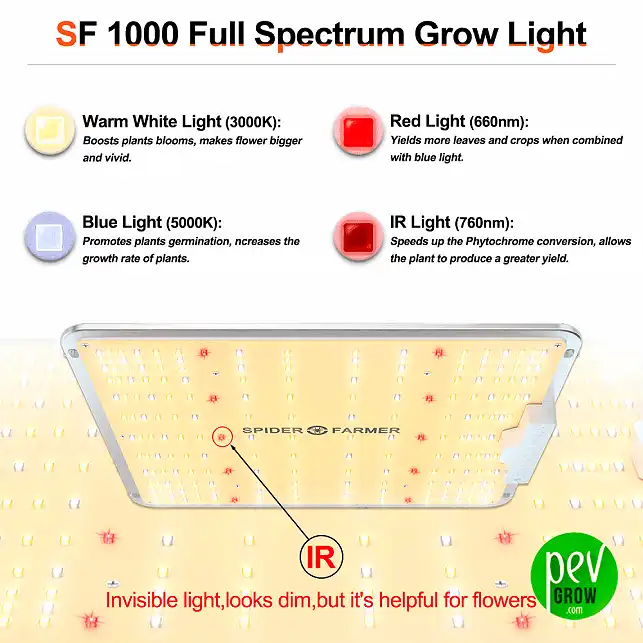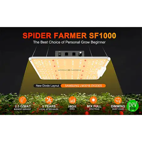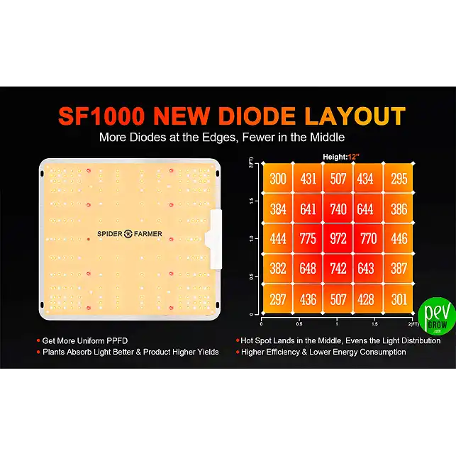 Jakmile se vaše semena vylíhnou, Spider Farmer SF1000 se stane vaším nejlepším spojencem. Vestavěný stmívač umožňuje upravit intenzitu bez změny spektra. Na začátku (asi 40–60 %) nastavte nižší intenzitu během fáze sazenic, aby nedošlo ke stresu, a během květu zvyšte na 100 %. Samsung diody poskytují bohaté plné spektrum (3000K, 5000K, 660nm červené a IR), které napodobuje přirozené sluneční světlo.