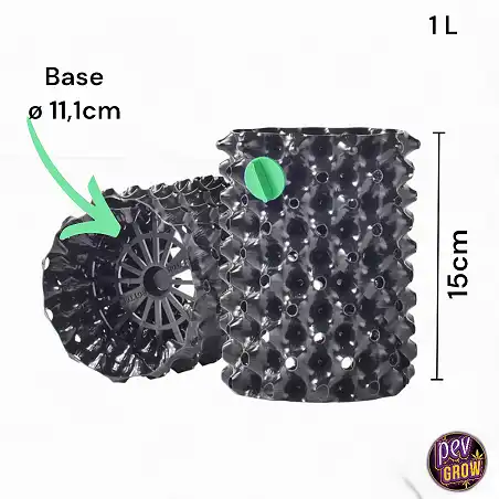 Die Air-Pots-Töpfe weisen eine kreisförmige Struktur auf und bestehen aus einer perforierten Wand, die innen geschlossene Zapfen und außen offene Zapfen aufweist. Sein Design vermeidet das Vorhandensein flacher Oberflächen im Inneren, um Verformungen und Kräuseln der Wurzeln zu verhindern. Auf diese Weise ist gewährleistet, dass die Wurzeln nicht verderben oder sich verheddern. Die inneren Zapfen lenken und leiten das Wachstum der Wurzeln zu den offenen Zapfen an der Außenseite. Beim Erreichen der Außenseite entwässert die hochdichte Luft und „schneidet“ die Wurzelspitzen. Dieser Luftschnitt Vorgang regt die Bildung zahlreicher Wurzeln an und ermöglicht so eine optimale Entwicklung der Pflanze.