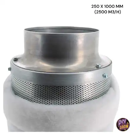 Der Filter wird am Ende des Luftansaug Kreislaufs platziert, er kann an den Stangen aufgehängt werden, die die Growbox an der Decke hat, oder auch an der Decke des Raums, falls er nicht in einer Growbox angebaut wird. Der Filter hat 2 Enden, eines ist abgedeckt, aber im anderen sehen Sie eine Öffnung, die den Anschluss für den Lüftungskanal darstellt, dieses offene Ende muss dem Luftauslass zugewandt und zu diesem Zweck mit Hilfe einer Schelle, eines Metallflansches oder eines speziellen Klebebandes angebracht werden. Die andere Seite des Lüftungskanals ist mit dem Abzug verbunden, der die Luft aus dem Anbau entfernt, und am anderen Ausgang des Dunstabzugs ist ein weiterer Lüftungskanal angeschlossen, der zu einem Fenster oder Ausgang ins Freie geführt werden muss.
