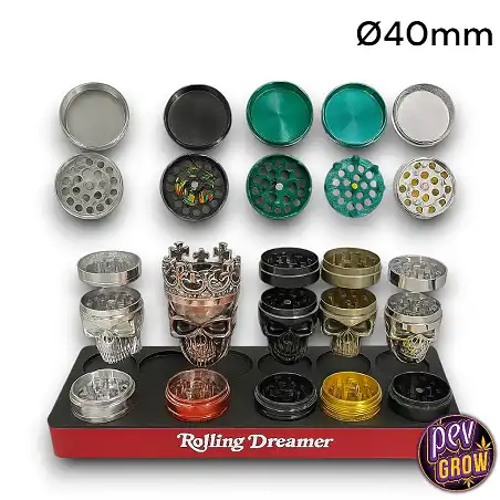 Der Aussteller 24 Mini Grinder Metall enthält 12-Grinder, die ideal sind, um sie überallhin mitzunehmen. Kompakt und robust, sind sie perfekt für einen Abend mit Freunden oder für die ruhigen Momente, die Sie so schätzen.