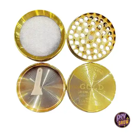 Der Grinder ist aus hochwertigem Metall, in der Regel eloxiertem Aluminium, gefertigt und mit einem eleganten Gold-Finish versehen. Einige Luxusmodelle können eine 24-Karat-Vergoldung aufweisen, aber die meisten sind für ihre goldene Optik eloxiert.