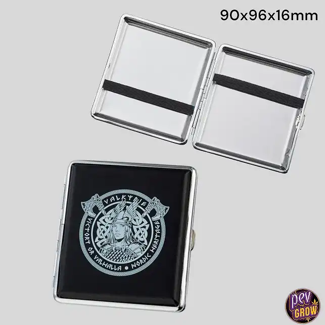 Mit einem Design, das eine Walküre zeigt, ist dieses Zigarettenetui perfekt für diejenigen, die die Stärke und Mystik dieser mythologischen Figuren schätzen. Die Walküre ist von keltischen und skandinavischen Motiven umgeben, die ihren mythischen Aspekt betonen.