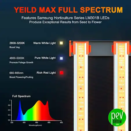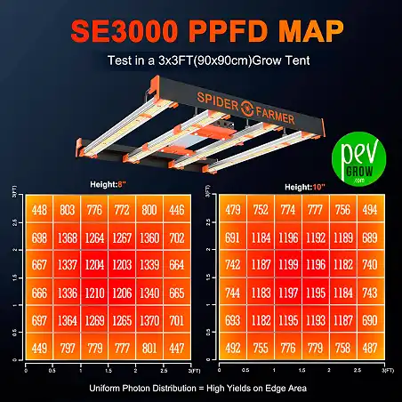 Die Grow-Lampe Spider Farmer SE3000 ist eine Struktur mit 4 LED-Leisten, die 61 x 57,5 x 9,4 cm misst und 7,16 kg wiegt, eine ideale Größe für den Einbau in 80 x 80 cm große Grow-Boxen. Sie ist stark genug, um bis zu 90 x 90 cm während der vegetativen Wachstumsphase und bis zu 70 x 70 cm in der Blütephase zu beleuchten. Unter den 4 Balken fügt es insgesamt 896 Samsung LM301B-Dioden hinzu, ist dank seines passiven Dissipationssystems super unauffällig und in der Leistung einstellbar, um es jederzeit während der Ernte anpassen zu können.
