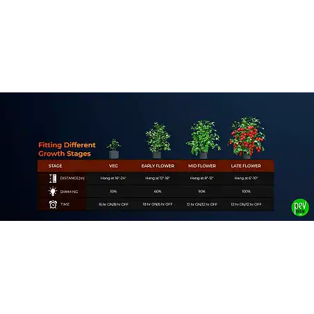 Um jederzeit das bestmögliche Licht zu geben, empfiehlt es sich, neben der Möglichkeit, die Leistung zu regulieren, die LED schrittweise näher zu bringen, während die Pflanzen die Phase durchlaufen. Unten sehen Sie die Hängehöhe des Spider Farmer SE3000 in jedem Stadium des Anbaus: