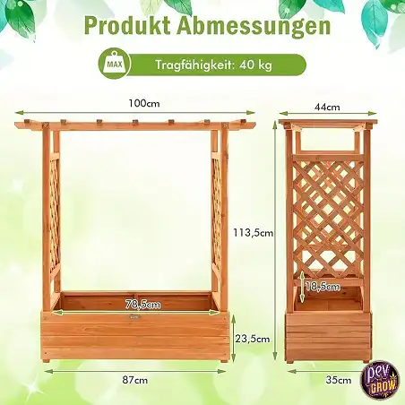 Das Hochbeet besticht durch sein natürliches Holzdesign, das sich harmonisch in jede Umgebung einfügt. Mit seinen Maßen von ca. 113 x 87 x 180 cm (Gesamthöhe mit Dach und Rankhilfen) bietet es ausreichend Platz für eine Vielzahl von Pflanzen, ohne dabei zu viel Raum einzunehmen. Die robuste Holzkonstruktion gewährleistet Langlebigkeit und Stabilität. Es ist die ideale Wahl, wenn du Wert auf Ästhetik und praktische Anwendbarkeit legst. Kombiniere es mit unseren hochwertigen Blumentöpfen für drinnen und draußen, um ein stimmiges Gesamtbild zu schaffen.