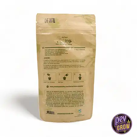 You can already find in Pevgrow Green House's BioGrow fertilizer, a solid organic nutrient ideal for the growth phase of both feminized and autoflowering marijuana plants. The phrase that best summarizes its characteristics is "All-in-one", since with this base fertilizer you will not need any other nutrients in the vegetative phase. The NPK of Powder Feeding is 7-2-4, you will only need to mix 3 grams per liter of substrate and you'll be able to feed your plants with the necessary food to grow strong and vigorous for 2 months, which is the time it takes to completely release.