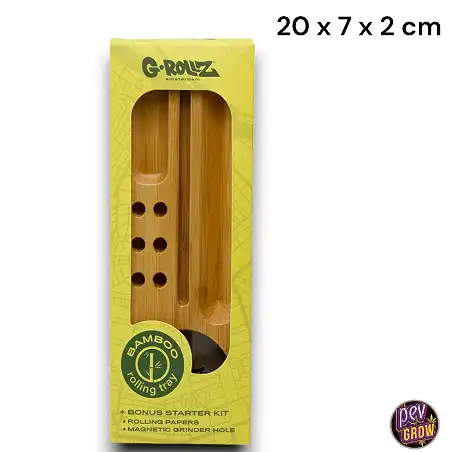 G-Rollz rolling trays, made of lightweight and durable bamboo, include storage, magnetic band, grinder card, and specific areas for rolling and tips. Perfect for carrying everything you need and rolling easily anywhere. Dimensions: 20x7x2cm