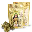 Premium Golden Kush CBD Flowers, 2 grams, indoor-grown with organic fertilizers to provide you with the best flavor and medicinal effect, come in a glass container with a wooden lid.