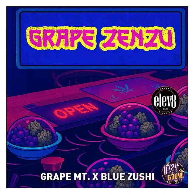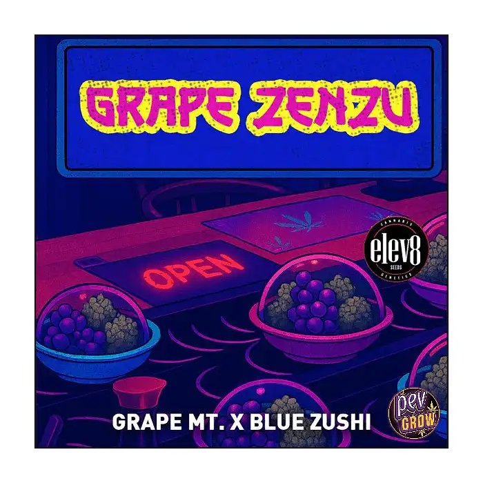 Are you ready to experience a truly exotic and rewarding cultivation? At Pevgrow, we bring you Grape Zenzu feminized seeds from the renowned Elev8 Seeds bank, a strain designed to captivate your senses and deliver an unforgettable experience. This hybrid marvel is the result of a masterful cross between Grape Mountain and Blue Zushi, combining the best of both worlds to offer you a unique profile in every aspect.