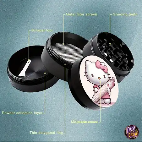 Don't settle for less when it comes to your grinding experience. The Hello Kitty 4-Part Pollen Grinder offers the perfect combination of durability, efficiency, and style. At Pevgrow, we understand your needs for quality and discretion, offering you the best products at competitive prices. Elevate your sessions and enjoy the perfect grind every time. Order yours today and experience the difference!