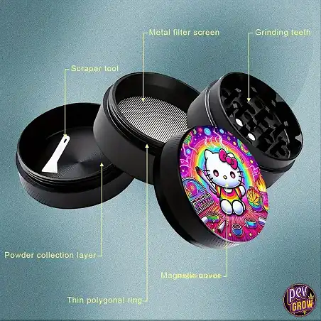 The Hello Kitty Stoned Pollinator Grinder is more than just a tool; it's a statement piece for your collection. This weed grinder features a fun, iconic Hello Kitty design with a "Stoned" twist, making it truly unique. Crafted from durable alloy, this 4-part grinder is engineered to provide an exceptionally smooth and consistent grind for your favorite herbs. Its multi-chamber design includes a dedicated kief catcher, allowing you to collect the potent trichomes that fall off during grinding, enhancing your overall experience.