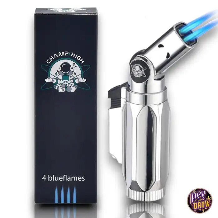 The Mini Serious Stuff Champ High Torch Lighter is a high-performance portable lighter designed to provide a superior lighting experience. Its quad blue flame ensures optimal combustion, ideal for lighting your CBD flowers, heating bangers, or any other use that requires a powerful and reliable heat source.