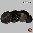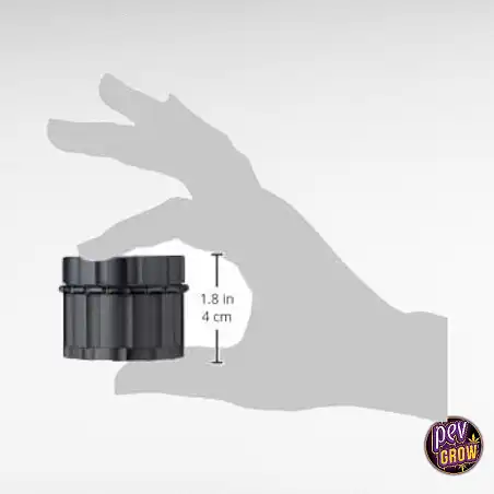 It is a manual grinder designed to grind weed efficiently, quickly, and effortlessly. It includes a storage compartment, a section with sharp teeth for grinding, a sieve to collect pollen, and a collection tray at the bottom. The pieces are magnetized to increase safety and facilitate use and cleaning.