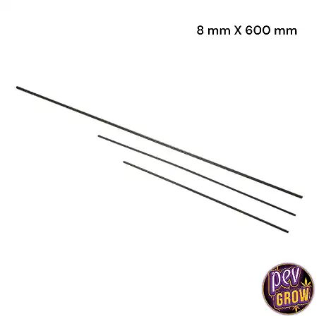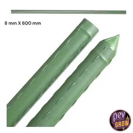 These plant supports are made of plastic-coated steel, a material that ensures their strength and durability. Additionally, it has a polyethylene (PE) coating that protects the steel from corrosion and extends its lifespan. Its dimensions, with a diameter of 8 mm, a length of 600 mm, and a weight of 0.300 kg, make it suitable for a wide variety of plants and crops.