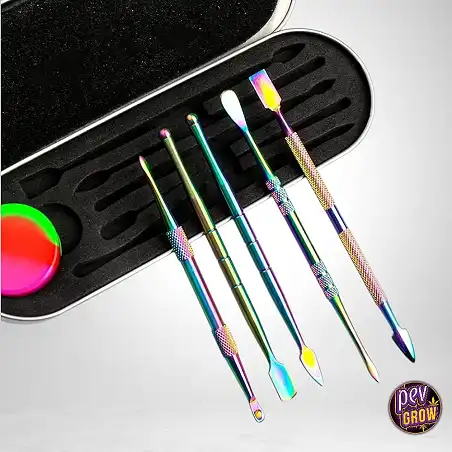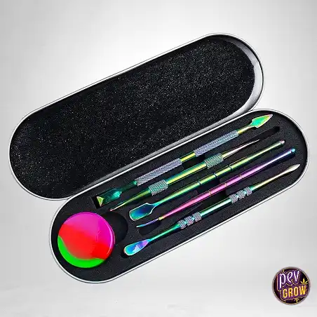 The Rainbow Steel Dabbers Kit + Silicone Mat is presented as a fantastic option for all those lovers of extractions and concentrates. Here you will find 5 double-ended tools, a 0.2 fl oz silicone jar, and a metal transport case, easy to carry, accompanied by a 15x15 cm silicone mat that offers a safe and mess-free space to work.