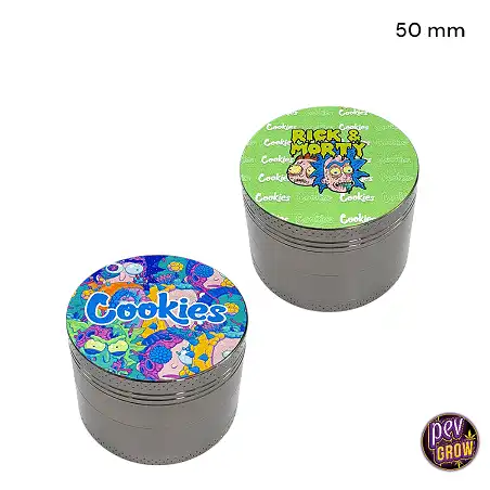 This is a premium metal grinder, specifically designed to finely mill your herbs while efficiently collecting pollen (kief) thanks to its integrated screen and collection chamber. What makes it truly special is its exclusive design: you get two grinders, one featuring the beloved characters from Rick and Morty and the other sporting the distinctive Cookies logo. Both are 50mm in diameter, making them compact yet highly effective for your daily needs.