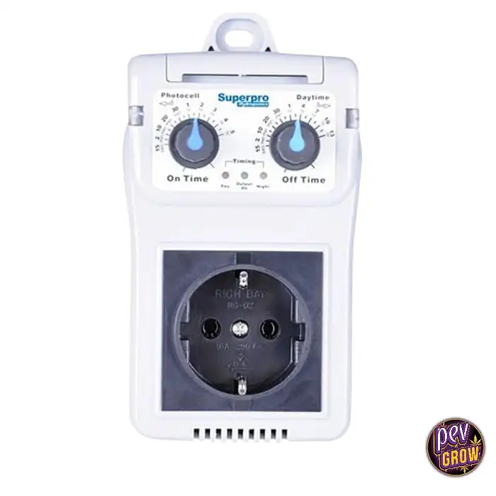 Using the Superpro Chrono B1 is straightforward, designed for maximum convenience. Simply plug the timer into a standard power outlet, then connect the device you wish to control (e.g., a fan, pump, or light) into the timer's receptacle. With its intuitive adjustment knobs and clear LED indicators, you can easily set your desired ON and OFF times, ranging from 15 seconds to 5 hours for ON cycles and 15 seconds to 13 hours for OFF cycles. The built-in photocell offers additional flexibility, allowing you to select Day, Night, or 24-hour operation modes, ensuring the timer activates precisely when you need it to, adapting to your grow room's specific lighting conditions.