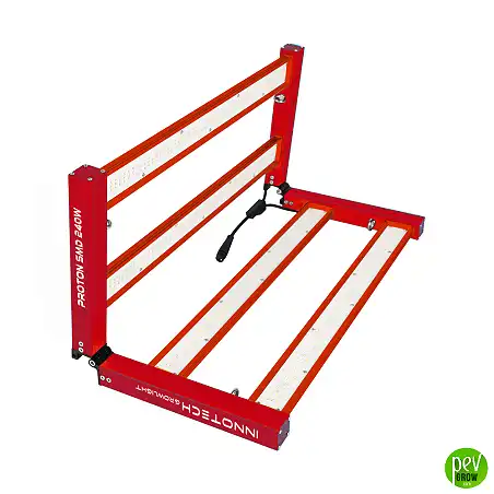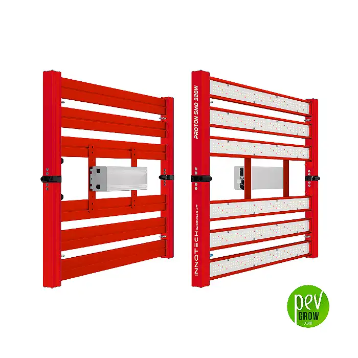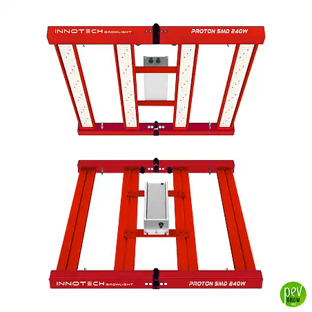 It is a luminaire made up of a folding bar structure, which makes it possible to work with the entire system or only with half. There are 2 different models, 240w and 320w, the 240w one contains 4 bars of 60w each, measures 50 x 60 x 6 cm, weighs only 3 kilos and is used to illuminate indoor growing spaces of around 80 x 80 cm. The 320w Proton SMD LED system contains 6 bars and is also foldable, measuring 60 x 80 x 6 cm, weighs 4 kilos and is used to illuminate an area of approximately 1 x 1 M.