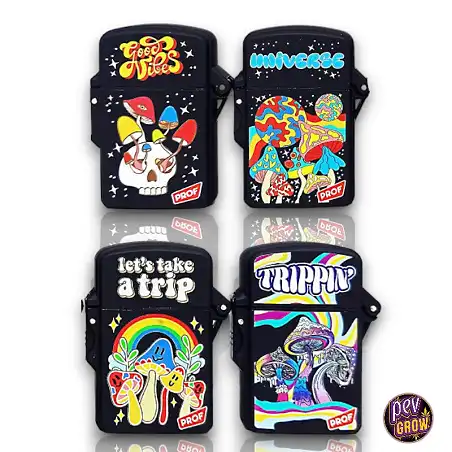 The Turbo Mushroom Lighter comes in four different designs: "Good Vibes", "Universe", "Let's take a trip" and "Trippin". Each one features an explosion of colors and elements that evoke the cannabis and psychedelic culture. It's not just a lighter, it's a statement of principles in your hand. Moreover, its high-intensity blue flame is visible with every light, demonstrating the quality and power of the lighter.
