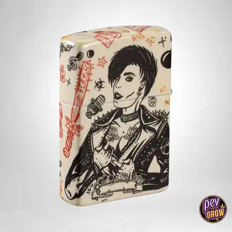 The Zippo Lighter Punk Rock Design 540° shines with its bold graphic design that combines the spirit of punk rock with a build quality that simply cannot be found anywhere else. When you hold it, you will feel its firm weight, ensuring that each use is a quality and durability experience. Its famous lid provides a tight seal, keeping the fuel safe and guaranteeing quick and reliable ignitions.