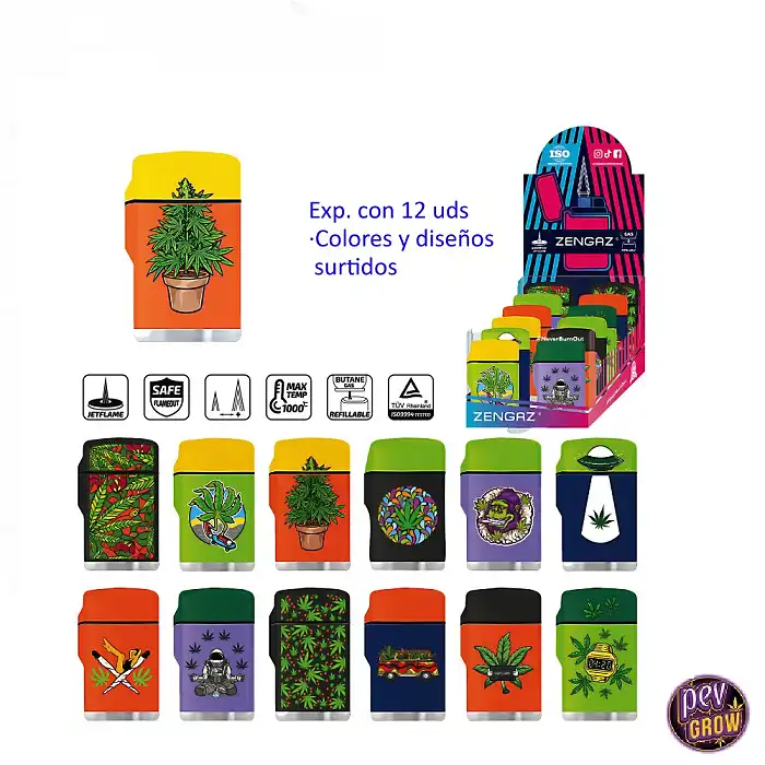 Este expositor es una colección de 12 mecheros tipo soplete, también conocidos como mecheros turbo jet, diseñados para ofrecer una llama potente y resistente al viento. Lo que los hace realmente especiales son sus variados diseños temáticos de cannabis, convirtiéndolos en un artículo imprescindible para cualquier coleccionista o para quienes buscan un toque distintivo en su parafernalia cannábica. Cada mechero es recargable con gas butano, asegurando una larga vida útil y un rendimiento constante.