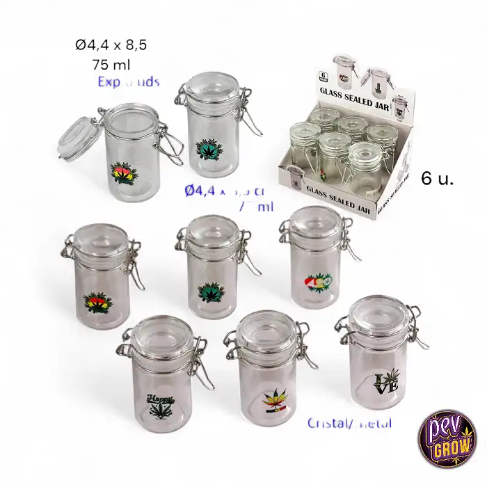 Cada bote tiene capacidad para 75 ml y unas dimensiones de Ø4.5 x 8.5 cm, perfectas para un almacenamiento práctico y eficiente. La hermeticidad de los botes garantiza que todo se mantenga fresco y en perfectas condiciones, evitando la entrada de humedad y aromas indeseados. Con su construcción en cristal resistente, no solo disfrutarás de su durabilidad, sino que también realzarás la estética de tu colección de cultivos.