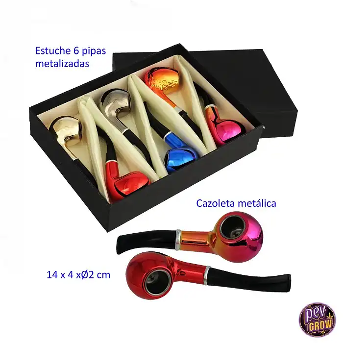 Este expositor incluye 6 pipas de metal, cada una con una longitud de 14 cm. El material metálico no solo garantiza una larga vida útil, sino que también contribuye a una experiencia de fumado más limpia y sin sabores indeseados, a diferencia de algunos materiales de menor calidad. El estuche es ideal para mantenerlas organizadas y protegidas, y la variedad de colores (según disponibilidad) añade un toque divertido a tu colección.