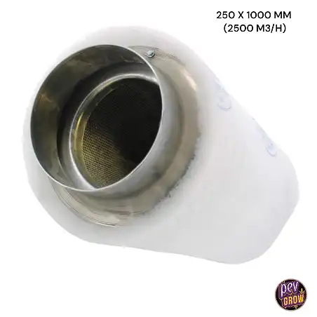 El filtro se coloca al final del recorrido del circuito de extracción de aire, se puede colgar en las barras que tiene el armario de cultivo en el techo del armario o también al techo de la habitación en el caso de que no se cultive en armario. El filtro tiene 2 extremos, uno lo lleva tapado pero en el otro verás una boca que es la conexión para el conducto de ventilación, hay que poner este extremo abierto mirando hacia la salida del aire y con la ayuda de una abrazadera, una brida metálica o cinta adhesiva especial para este cometido. El otro lado del conducto de ventilación se conecta al extractor que saca el aire del cultivo, y en la otra salida del extractor se conecta otro conducto de ventilación que se tiene que llevar hasta una ventana o salida al exterior.