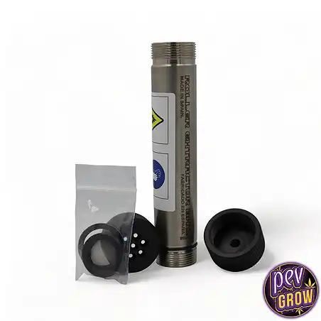 Une extrémité est livré avec un petit trou pour introduire le gaz à travers le robinet de la bouteille, à l'autre extrémité a un trou plus grand avec une maille à 60 microns, qui permet de garder la matière végétale.