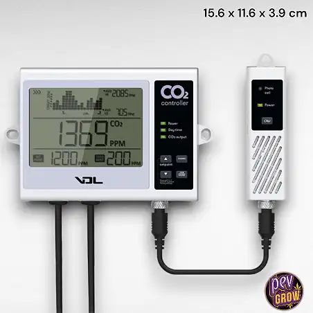 Le Contrôleur Numérique Co₂ Vdl est un contrôleur facile à utiliser, destiné à mesurer et à maintenir les niveaux de CO₂ dans votre serre ou salle de culture. Il contient un grand écran LCD numérique où vous pouvez lire en temps réel les niveaux de ppm, le jour, l'heure, les minutes, les alarmes, etc.